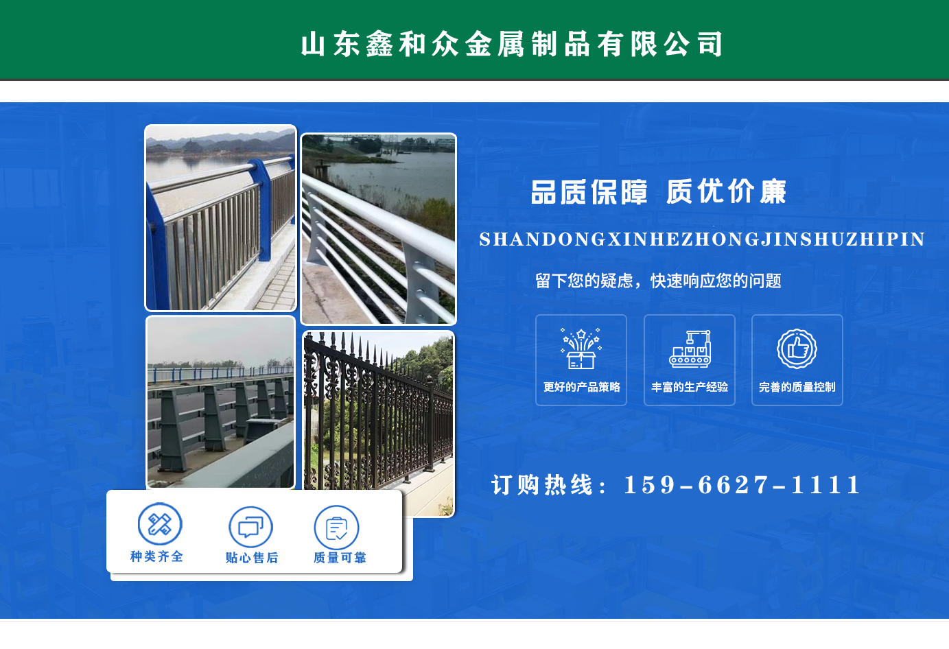 山東鑫和眾金屬制品有限公司主要產品有防撞護欄,橋梁護欄,道路護欄,河道護欄,不銹鋼護欄等護欄。提供設計方案,一站式定制,包您滿意價格優(yōu)惠,歡迎來電咨詢! 公司常年從事銷售護欄防撞護欄,橋梁護欄,道路護欄,河道護欄,不銹鋼護欄,橋梁鋼護欄,河道燈光護欄等。產品廣泛應用于橋梁、河道、旅游景區、道路、公路、公園、小區、景觀、道路防撞等領域。 公司產品均采用優(yōu)質不銹鋼材料,符合相關標準。各種型號不銹鋼復合管及護欄,質量嚴格把控。產品強度高、耐腐蝕、焊接牢固、抗沖擊、性能好,防撞護欄結構簡單、美觀實用大方?! g迎前來訂購!...